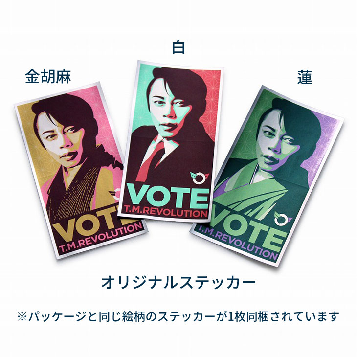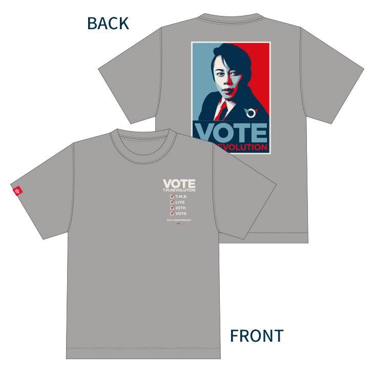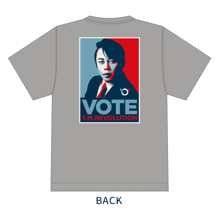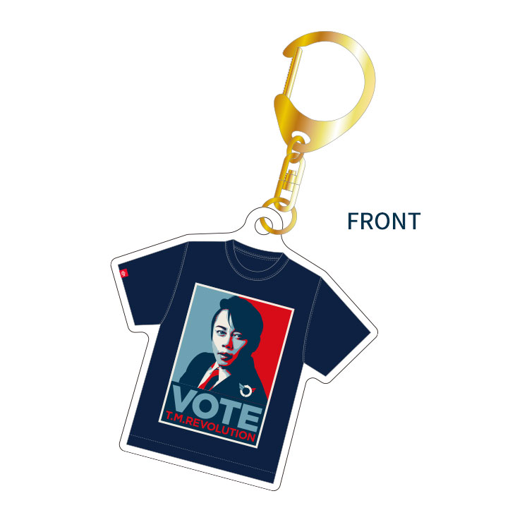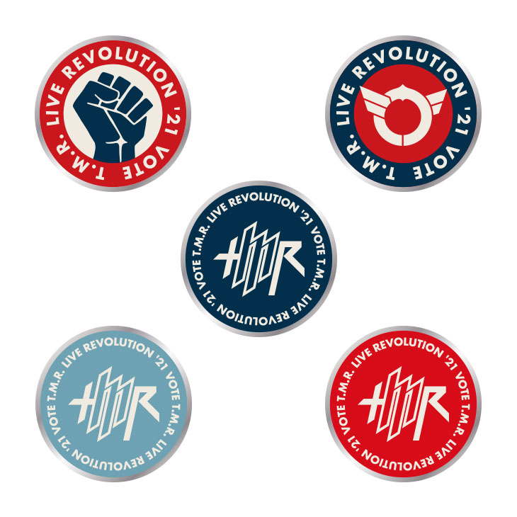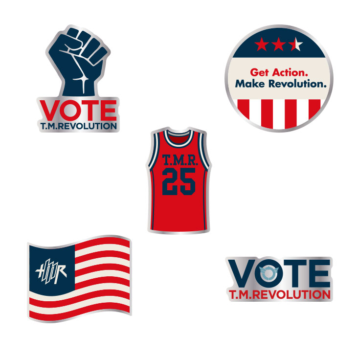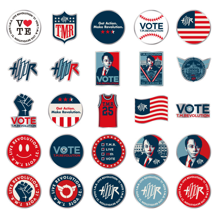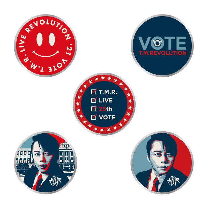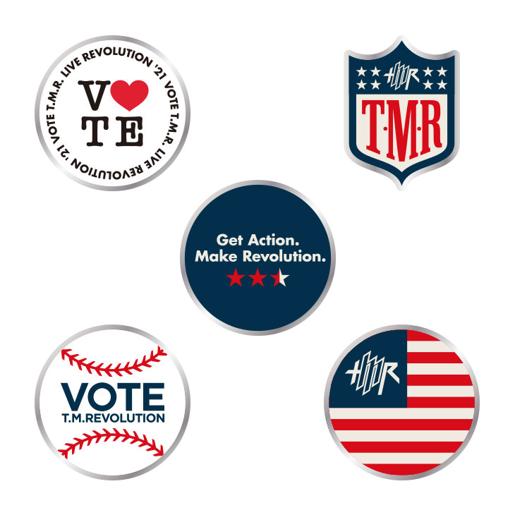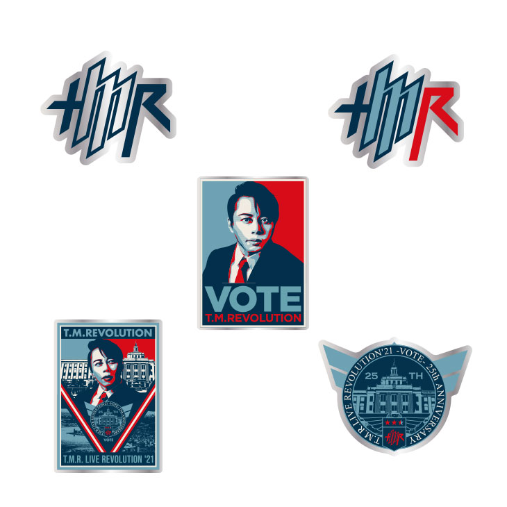 "VOTE"イメージやT.M.R.ロゴデザインのピンバッジ。